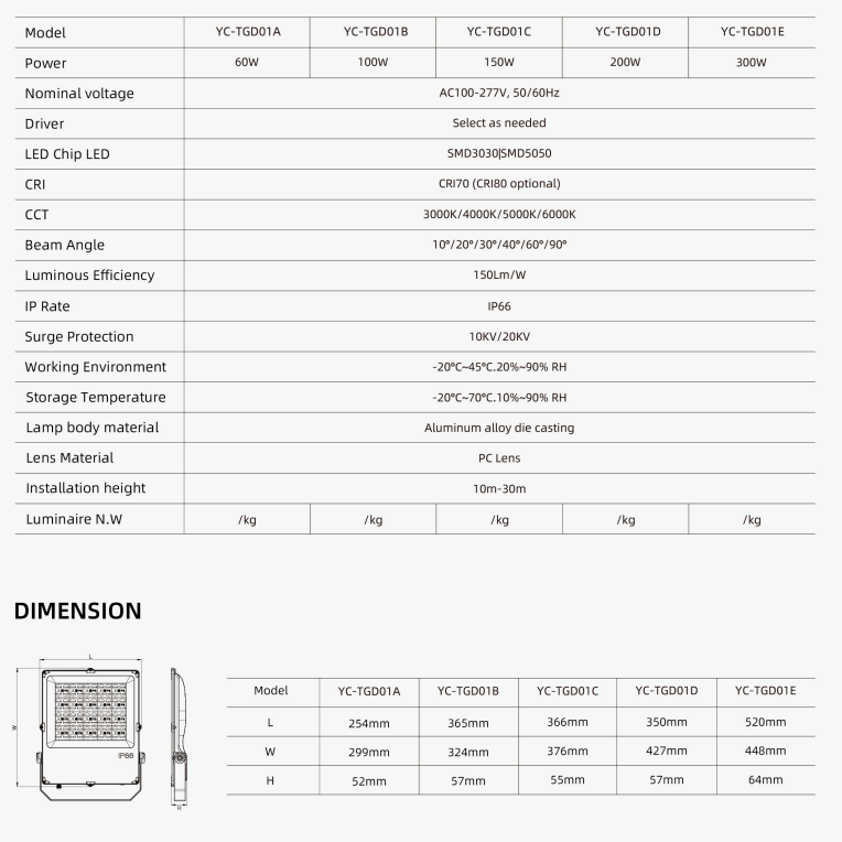 | YC-TGD01-50W | 358*294*52 | 50 w | Heat sink Aluminum body,Glass,Bracket,304 screws, PCB, lent. |
